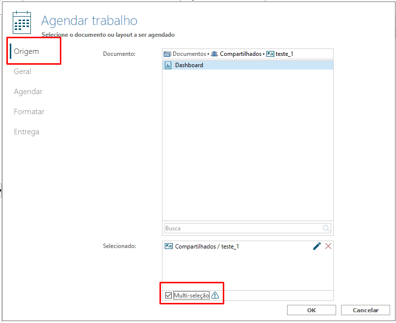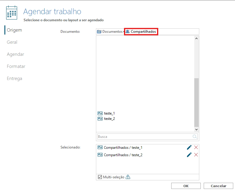 Repare que ao clicar em cada relatório, ele será adicionado em "Selecionado";