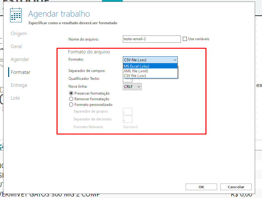 2 - Em FORMATAR escolher o formato de envio