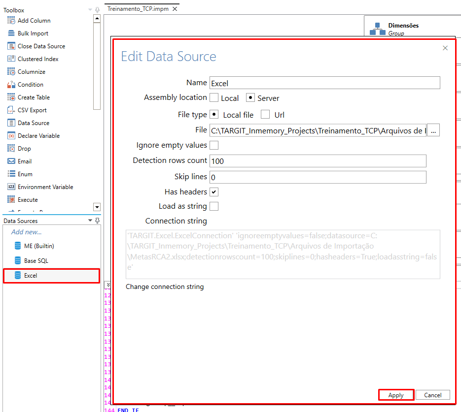 3- Após clicar no Data Source desejado, irá abrir uma caixa com as informações da conexão de dados e caso queira mudar algo é só editar clicar em "Apply".