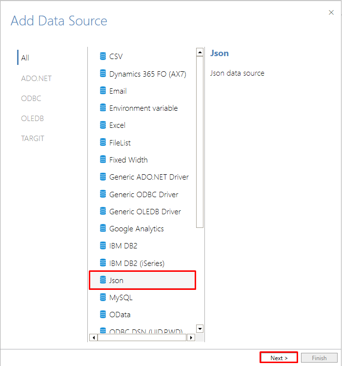 Dúvida Como adicionar um arquivo JSON ao data source? Ambiente TARGIT BI Versão Update 4.1 build 210825001 Projeto Enterprise Solução Dentro do ELT Studio clique em "Add New": Selecione o tipo de arquivo, no caso, JSON: Selecione em Assembly Location ...